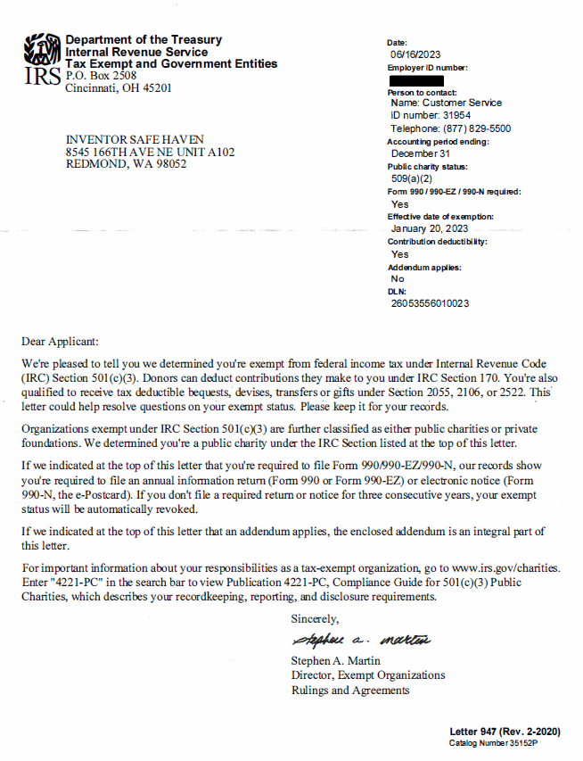 As per the letter received dated 06/16/2023, “donors can deduct contributions they make” to us under IRC Section 170. The nonprofit is also “qualified to receive tax deductible bequests, devises, transfers or gifts under Section 2055, 2106, or 2522”. The charity has been classified as a “public charity”.
